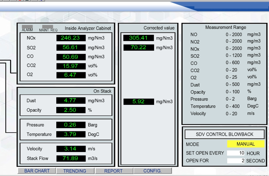 CEMS (Continuous Emission Monitoring System) for 3 Streams, measuring CO, O2, SO2, NOx, NO, NO2, Dust, Opacity, Flow using ABB Analyzer AO2000 for a Power Plant