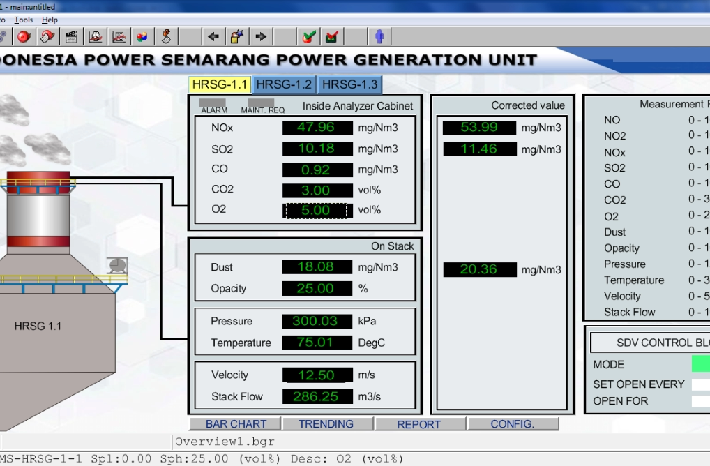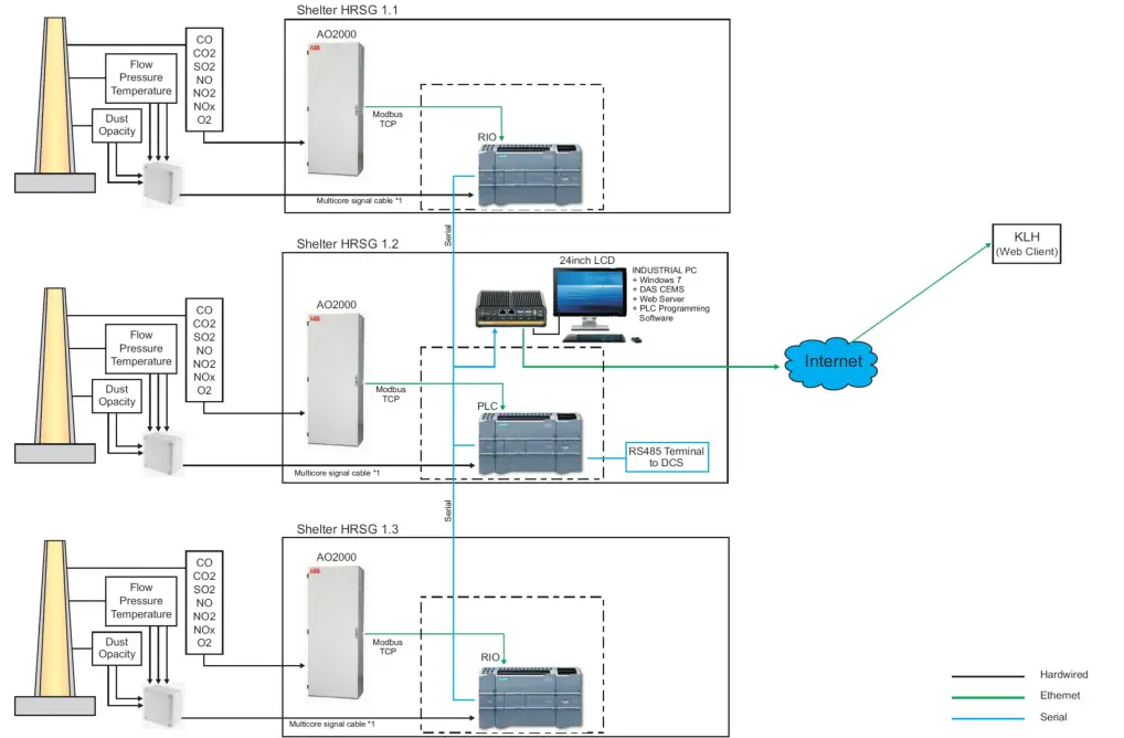 CEMS (Continuous Emission Monitoring System) for 3 Streams, measurinG CO, O2, SO2, NOx, NO, NO2, Dust, Opacity, Flow using ABB Analyzer AO2000 for a Power Plant