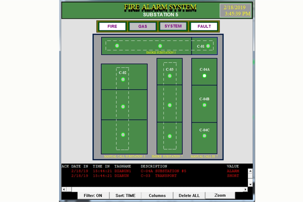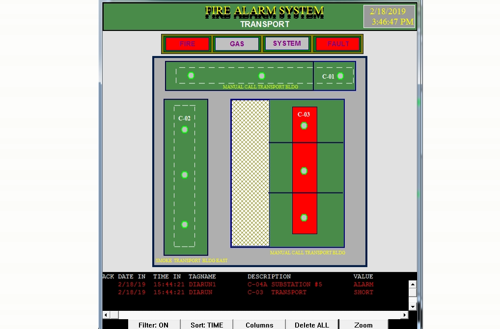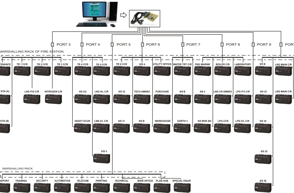 •Smoke, Gas Detectors distributed in 700 zones (non addressable)•Twisted pair cable network up to 8Km radius; •PC with Multiport Digiboard in PCI Slots.